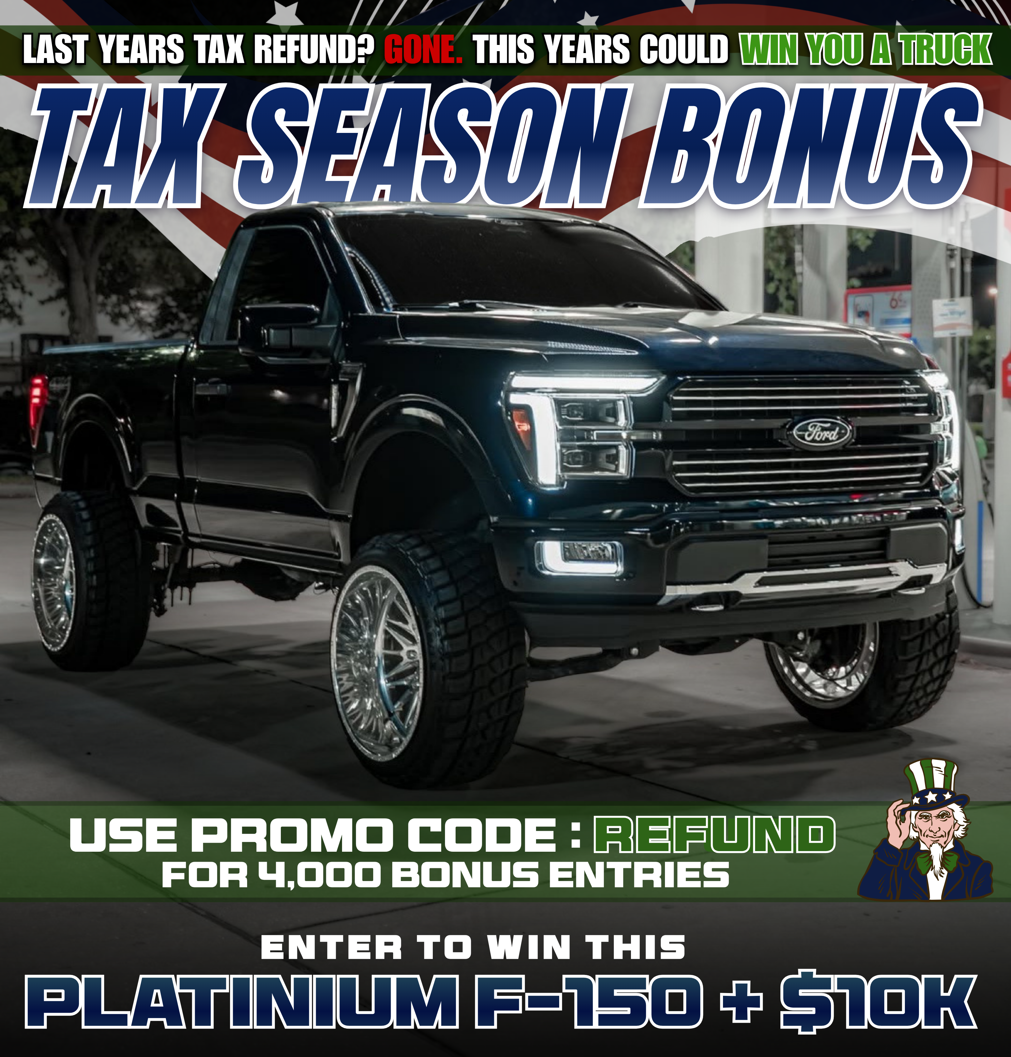 FORD F-150 + $10,000 cash. Winner flies out to HQ and gets everything in person.