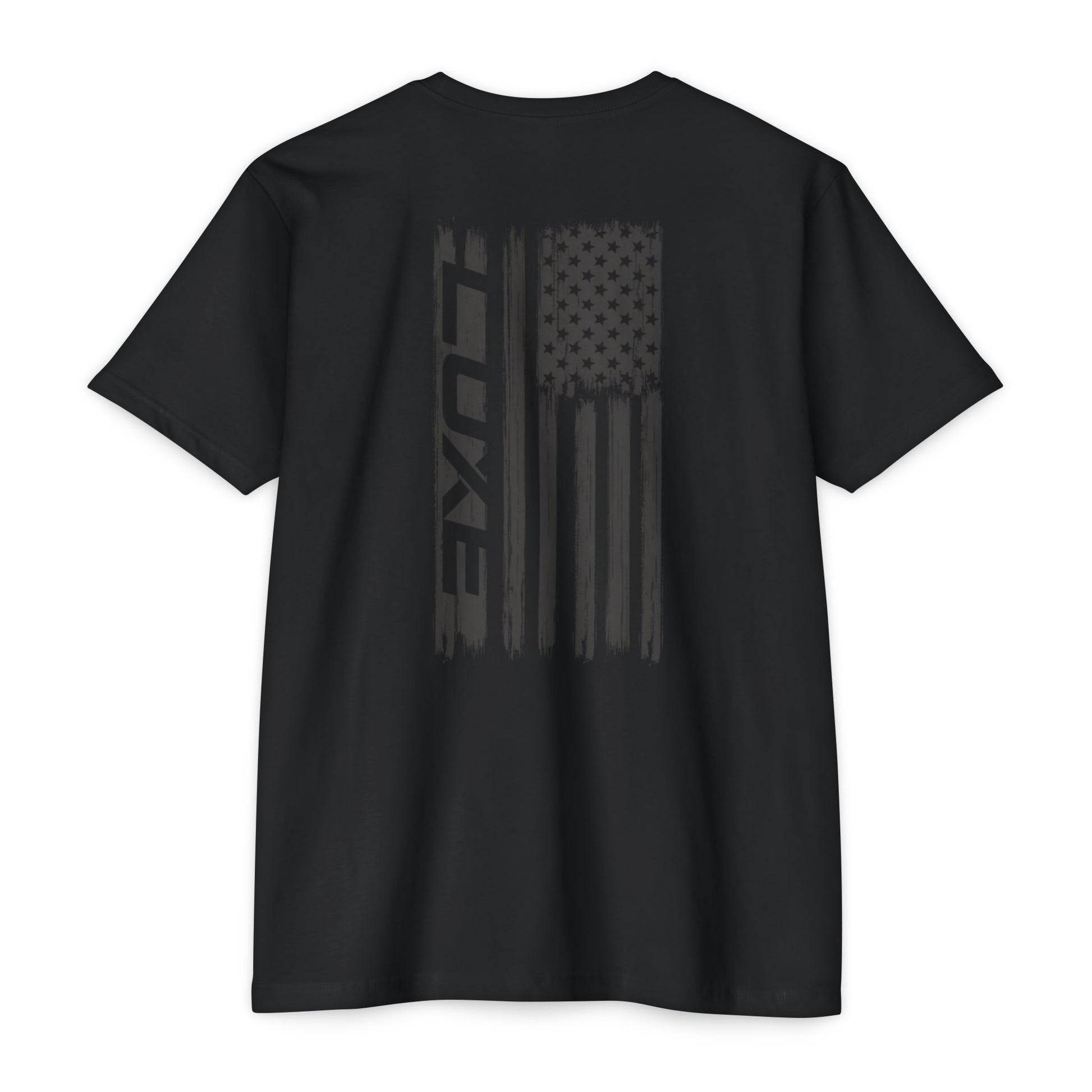 A clean, understated tee that speaks quiet confidence. This lightweight crewneck sits comfortably against the skin with a soft, smooth hand from combed ring-spun cotton and polyester. The front shows a low-contrast “LUXE Build Co.” mark that reads like a nod to craftsmanship rather than a loud logo. On the back, a distressed, vertical American-flag motif and subtle brand stripe add rugged character without shouting. Wear it on site runs, weekend projects, or around the city when you want a practical, refined look that blends work-ready grit with minimalist style.