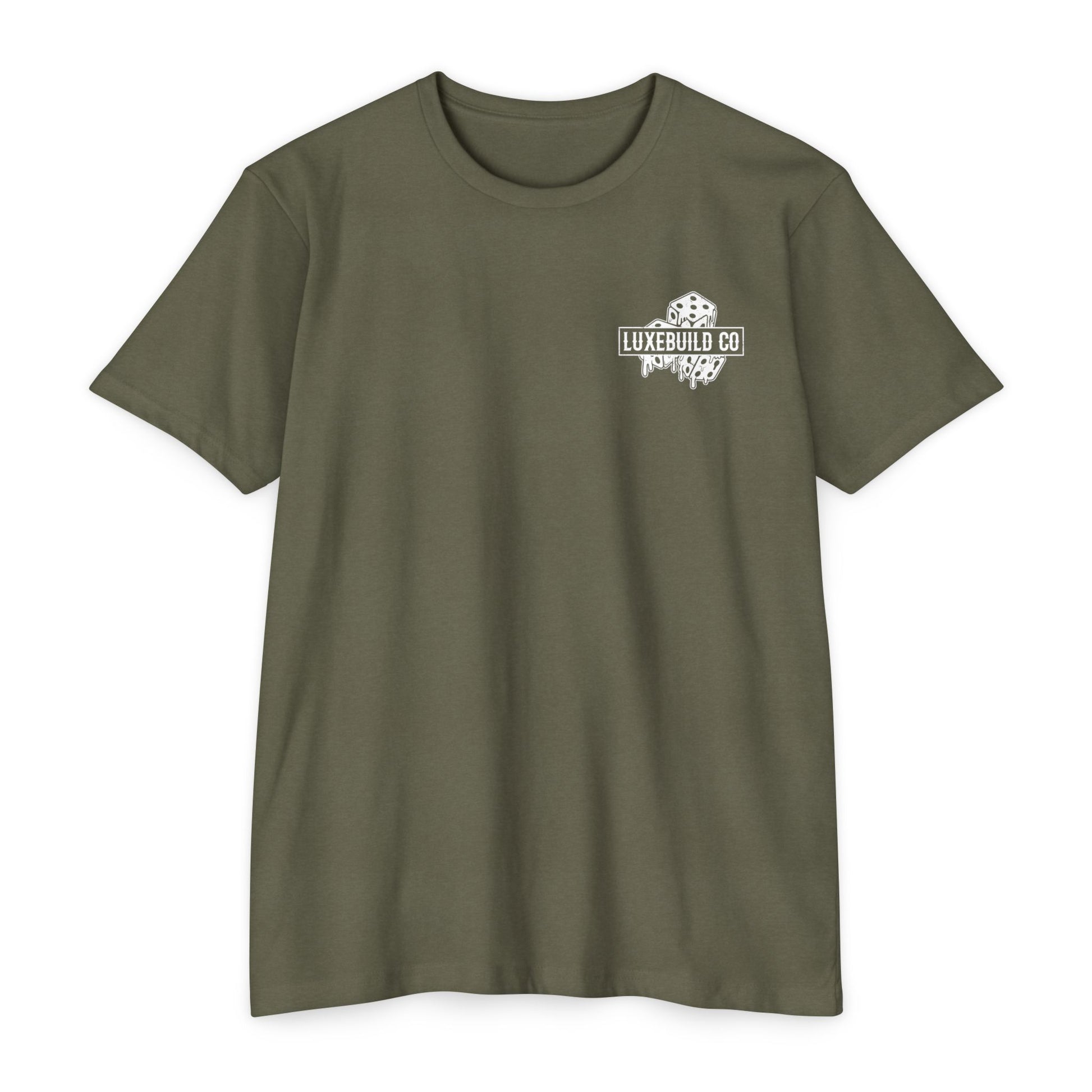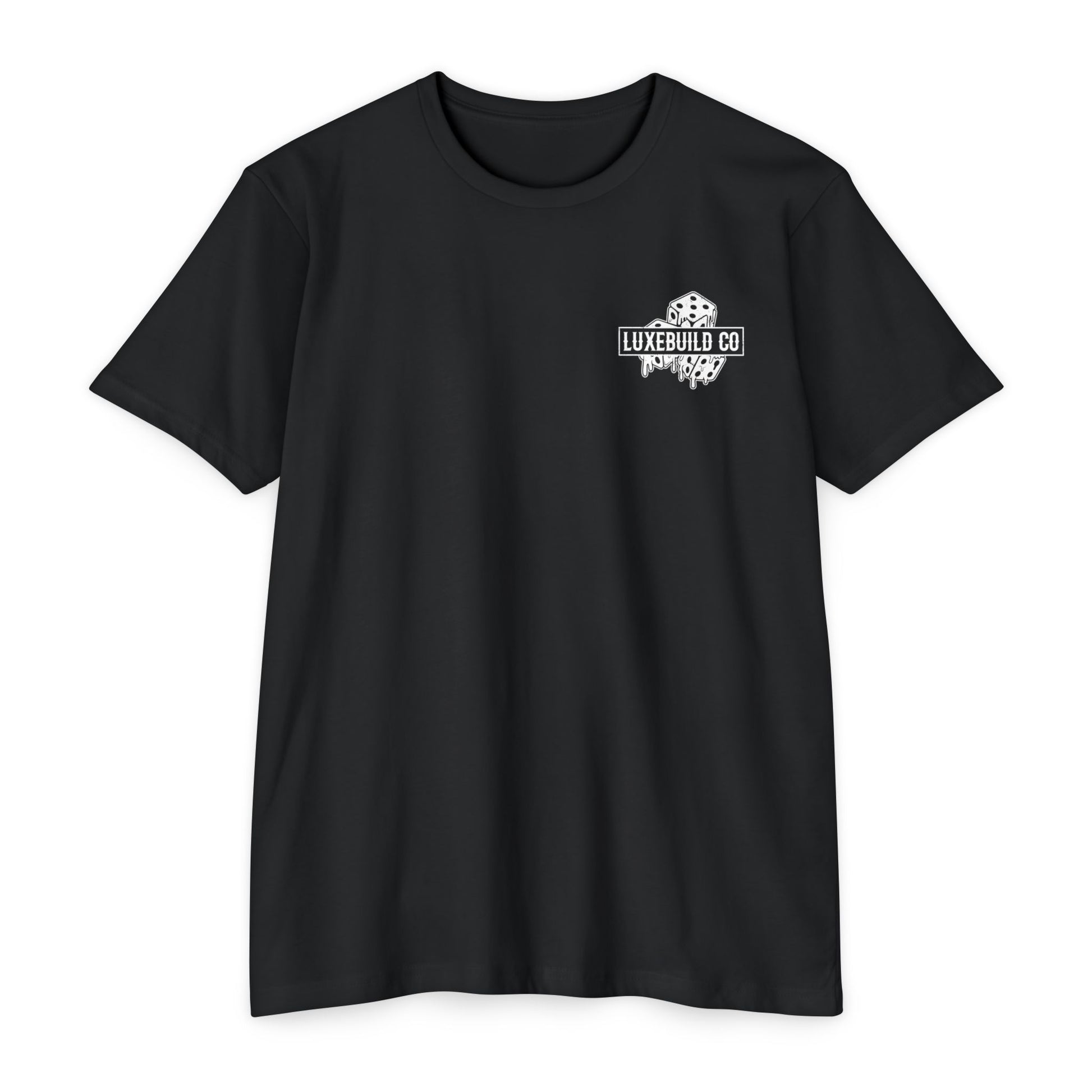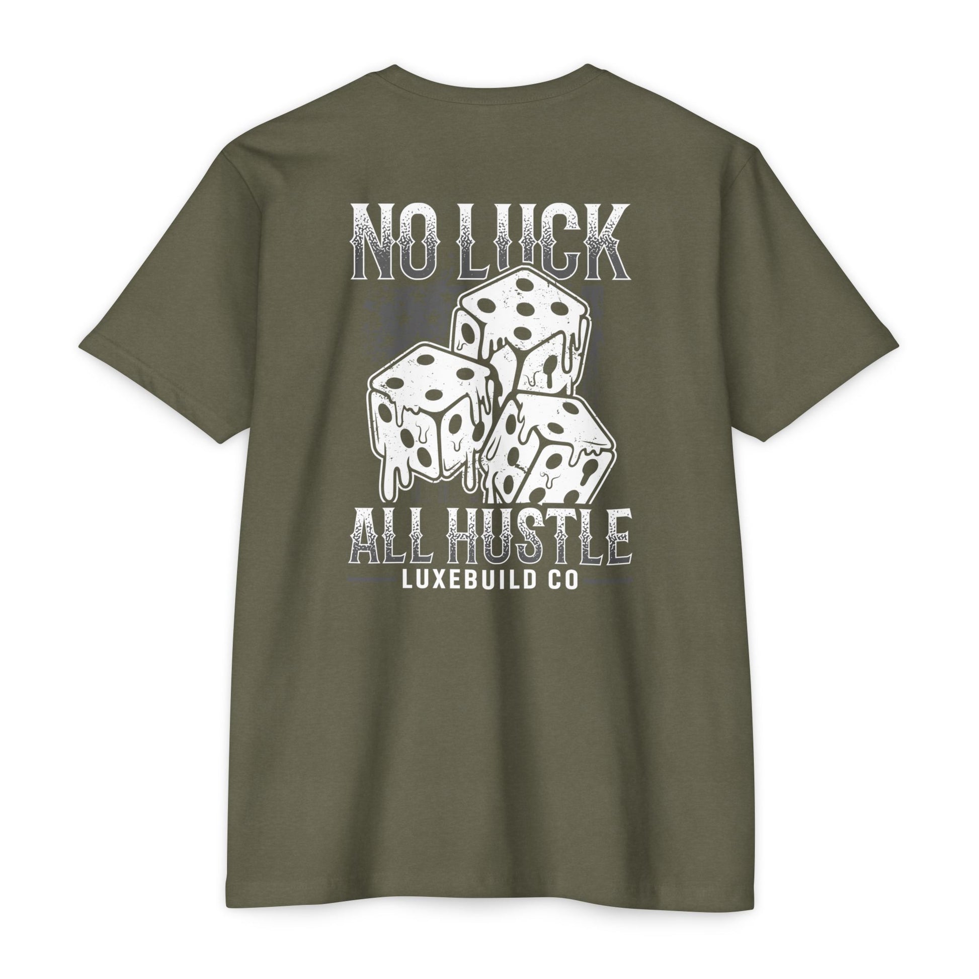 This lightweight jersey tee carries a lived-in energy — a quiet confidence you feel the moment you pull it on. Front chest art reads small and deliberate, while the back declares the attitude: three trembling dice with the line “NO LUCK / ALL HUSTLE.” It sits casual and true to size, with a softened hand from combed ring-spun cotton and polyester that keeps prints crisp and comfortable. Wear it on long days on the job, late-night side projects, or when you want to signal that results come from work, not chance.